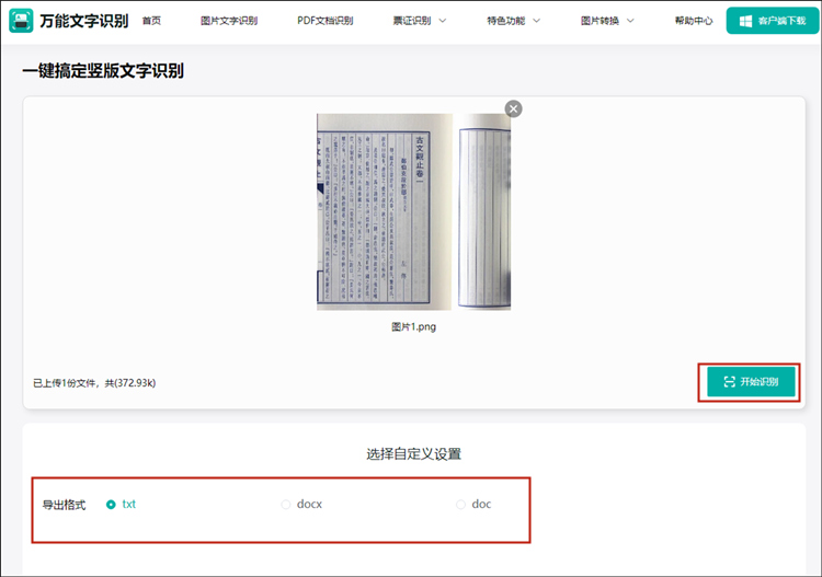 操作步骤三:图片上传好后,在下方的“选择自定义设置”中选择自己需要的文件导出格式,随即点击【开始识别】按钮。